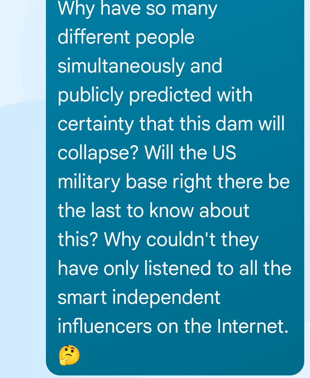 But you respond, “those people and that dam will be safe because there is a US military base right at that dam to ensure safety.”